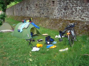 Het leek wat weer betreft een goeie dag te worden maar die indruk werd gewekt om half zeven in de morgen. Na uitgebreid mijn ontbijt te hebben gemaakt en verorberd was ik om half acht alweer startklaar voor de volgende etappe. Nauwelijks was ik aan het fietsen en begon het te mieseregenen.